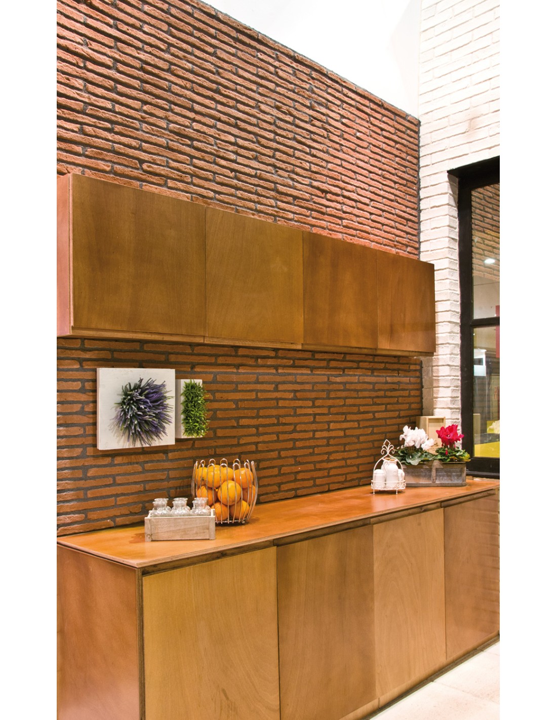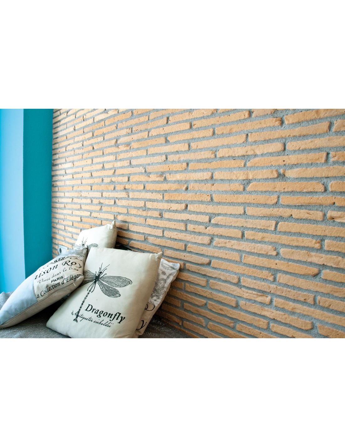 Revestimiento de hormigón aligerado aspecto ladrillo fino y alargado para interior y exterior. Disponible en 2 colores y también pieza disponible para esquina.